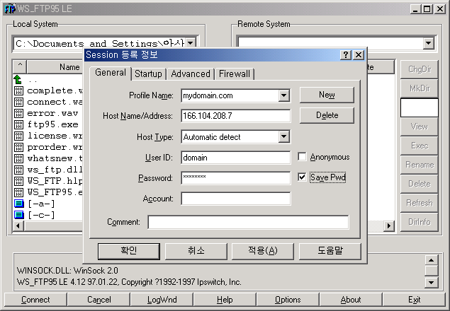 • 여기 Session 등록정보에 자신이 주로 사용하는 FTP 서버나 Anonymous FTP 서버의 정보를 기록해 두면 다음 번에 FTP 서버에 접속할 때에는 접속하려는 FTP 서버의 Profile Name 만으로 쉽게 접속할 수 있습니다. 새로 FTP 서버에 대한 정보를 기록하는 방법은 호스트의 주소와 사용자 계정, 패스워드를 입력한 후에 [적용(A)]을 누르면 저장됩니다.