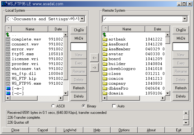 • 왼쪽에서 올리고자 하는 파일을 선택하고, 오른쪽에서 파일을 올릴 디렉터리를 선택한 후 를 누릅니다. 이 때, cgi 파일은 ASKII 형식으로, 그림 파일은 Binary 형식으로 보냅니다. HTML 파일은 어떤 형식이라도 상관 없습니다.
