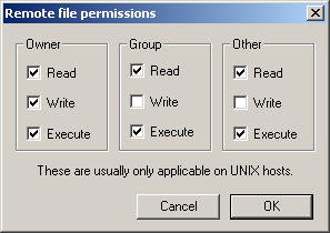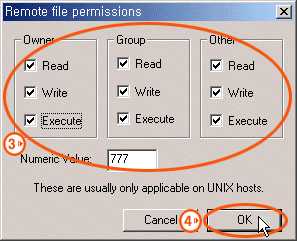 • 게시판이나 방명록과 같은 CGI 파일들을 사용할 경우 퍼미션을 조정해 주어야 하는 경우가 있습니다. 이럴 경우 아래의 설명을 참조하셔서 퍼미션을 조정하시면 됩니다. 그림의 체크박스에 적당히 체크를 하여 원하는 퍼미션으로 조정합니다. 그림과 같이 모든 체크박스에 체크를 하면 퍼미션이 777로 변경됩니다.