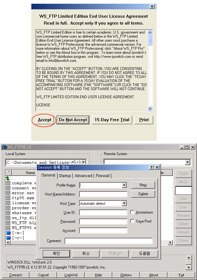 • 파일들 중 WS_FTP95.exe 를 두 번 클릭하면 아래와 같이 프로그램이 실행됩니다. Accept 를 선택하면 프로그램이 실행됩니다.