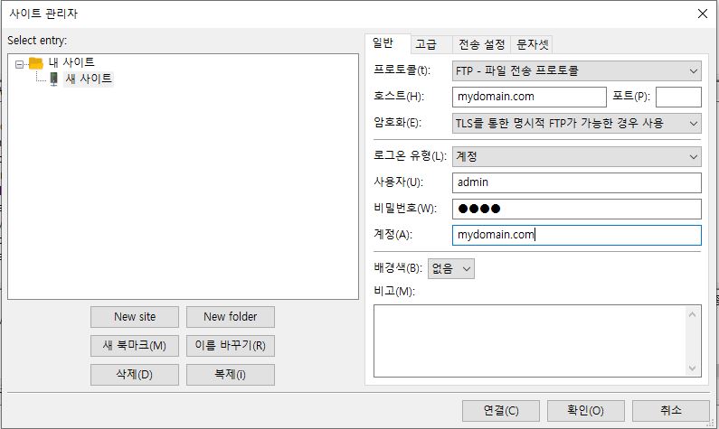 • 파일>사이트관리 관리자를 선택하면 아래와 같은 실행창이 나타나며 다음과 같은 순서로 사이트 정보를 기입하면 원하시는 사이트 계정에 접속이 가능합니다.
