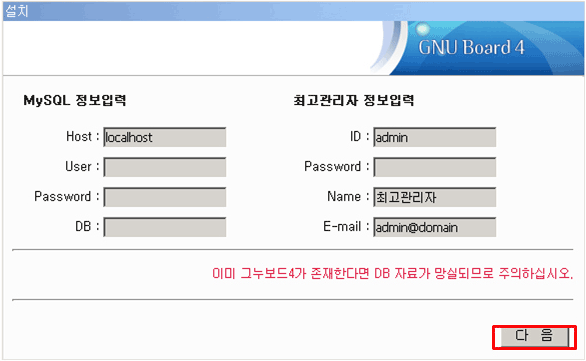 2단계, 고객님의 MYSQL 정보와 최고관리자 정보를 정확하게 입력하시고 "다음" 버튼을 클릭해 주십시오. |