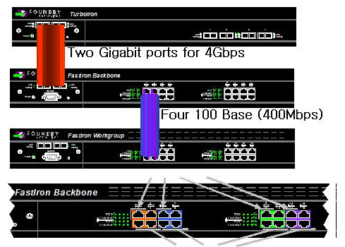 - 4개를 1세트로 사용할 수 있으므로 10/100 장비일 경우 100M씩 4개를 묶을 수 있으므로 최대 400M까지 묶을 수 있다.