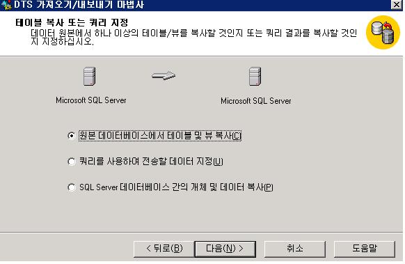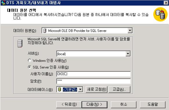 2. 데이터변환 마법사 창이 뜨는데, 여기서 다음을 선택하면 내보낼 데이터베이스를 선택할 수 있는 창이 뜹니다. Database 메뉴에서 내보낼 데이터베이스를 선택하고 다음으로 넘어갑니다.