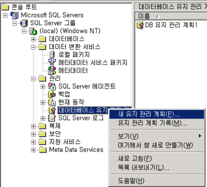 | local(WIndosNT) > 관리 > 데이터베이스 유지 관리 계획에서 오른쪽 마우스 클릭 > 새 유지 관리 계획 |