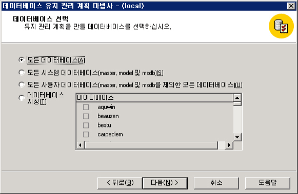 | (2) 데이버베이스 유지 관리 계획 마법사가 실행되면 이 중에 모든 데이터베이스를 선택한다. |