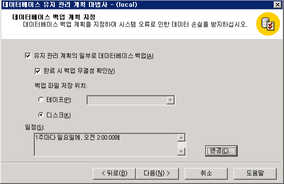 | (5) 데이터베이스 백업 계획 지정 - 일정을 변경해야 한다. 일정 > 변경 버튼을 클릭한다. |