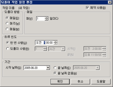 | ② 되풀이 방법은 매일, 시간은 풀백업이 실행되지 않은 오전 5시로 설정한다. |