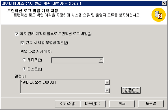| (7) 트랙잭션 로그 백업 계획 지정 - 7) 백업 디스크 디렉터리 지정과 동일하게 하면 된다. |