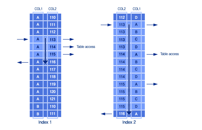 - B-Tree 방식으로 COL2 = 113이고 COL1 = A인 첫 번째 Row를 바로 찾는다.