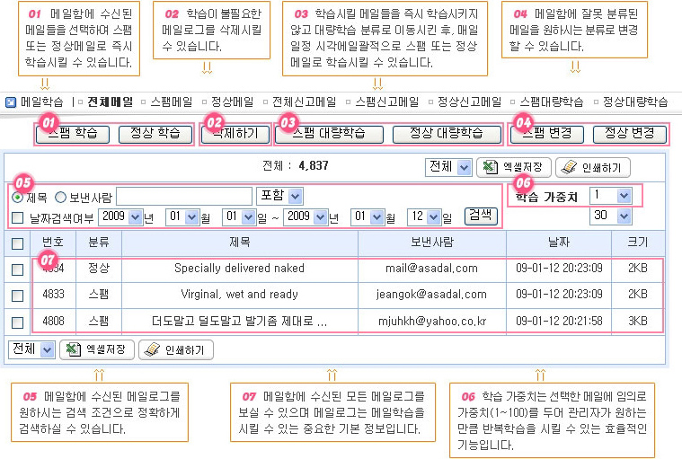 아사필터 관리자 페이지에서는 다양한 메일학습 기능을 제공합니다.