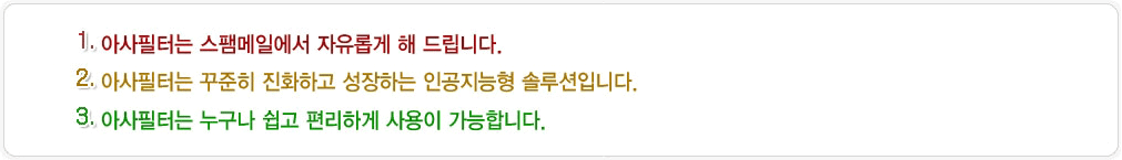 순수 자체 기술력으로 개발된 아사필터는 스팸필터링기술로서 관리자가 스스로 필터 DB를 구축하여 웹메일로 수신되는 모든 메일을 학습시킬 수 있으며 학습량에 맞추어 꾸준히 성장하는 지능형 스팸차단 솔루션입니다.