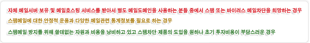 스팸필터링 기술은 메일함에 수신되는 많은 메일 중에서 사용자가 원하는 메일만을 수신할 수 있기 때문에 깨끗한 메일함을 유지할 수 있도록 도와줍니다.