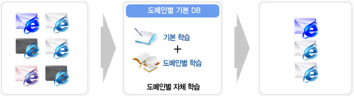 | 일정 수준 학습시킨 필터 DB를 사용하면서 도메인별로 관리할 수 있습니다. 이때 해당 도메인 성향에 따라서 관리가 가능하며 도메인만의 특별한 필터 DB를 구현할 수 있습니다. 도메인별 기본 DB를 사용하면 기본 학습된 정보와 도메인별로 사용자가 직접 학습시킨 정보로 사용자가 원하는 정확한 스팸필터링할 수 있습니다. |