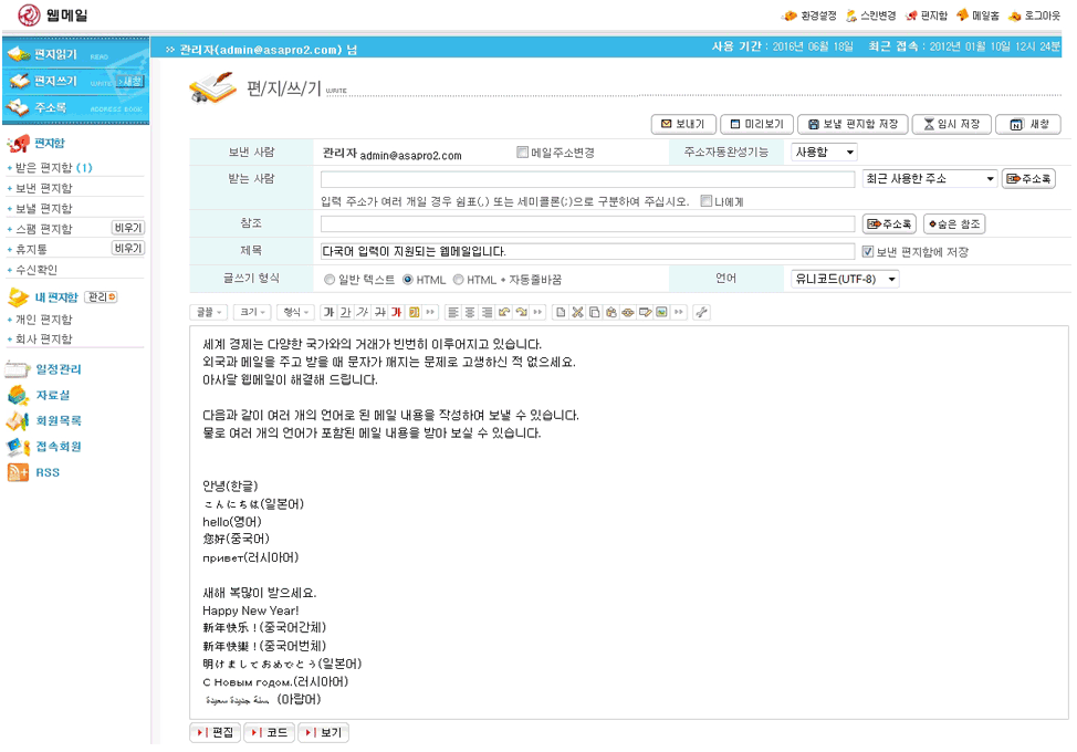 | - 유니코드(UTF-8) 지원을 하며 다양한 언어로 메일을 쓰고 받을 수 있습니다. |