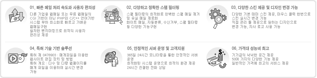 | 아사달을 통해 도메인을 등록했거나 아사달로 도메인을 이전하였을 경우 도메인으로 생성된 무료 웹메일 서비스를 이용하실 수 있습니다. 무료 웹메일은 신청일로부터 1년 간 무료로 서비스를 이용하실 수 있으며, 도메인을 계속 유지할 경우 무료 웹메일 서비스 또한 계속 제공 받게 됩니다. 인터넷이 접속되는 곳이라면 언제 어디서나 웹메일에 접속해 메일을 확인하실 수 있습니다. | |