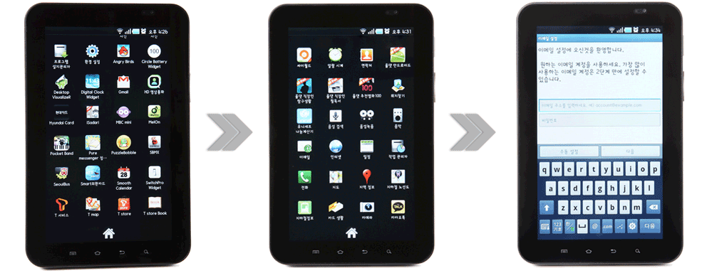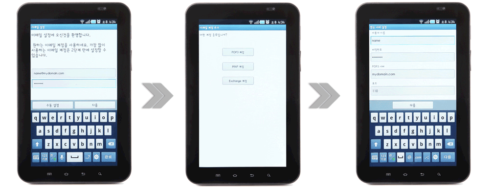 3. 이메일 설정 메뉴에서 이메일 주소와 비밀번호를 입력한 후 수동설정 버튼을 누릅니다. |