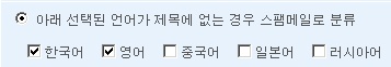 만일, 아래와 같이 언어필터링을 설정하셨다면, 메일 한국어와 영어가 없는 경우에 모두 스팸메일로 분류되어 보관됩니다.