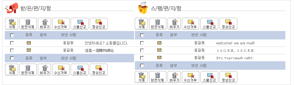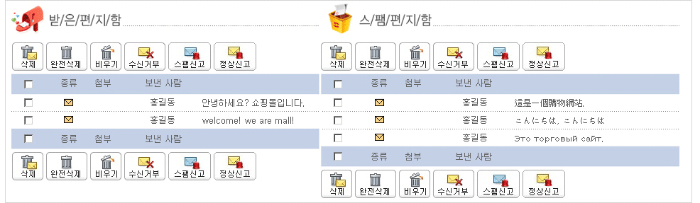 언어필터링은 사용자 설정에 따라 각각 다른 필터링 결과를 보여 줍니다. 사용자 메일함에 다음처럼 각기 다른 언어의 제목을 가진 메일을 발송한다고 가정할 때, 설정에 따라 스팸메일함에 분류 되는 것은 다음과 같습니다. |
