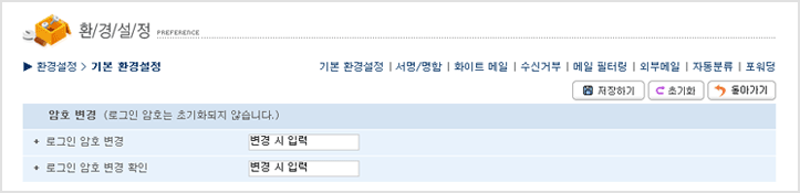 암호 변경 : 웹메일의 로그인 암호를 변경할 수 있습니다. 회원관리프로그램의 회원 암호를 변경하는 것이 아니며 오직 웹메일의 로그인 암호만 변경합니다.