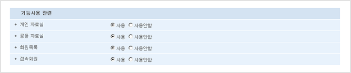 기능사용관련 : 개인 자료실, 공용 자료실, 회원목록, 접속회원 기능 사용여부 설정할 수 있습니다.