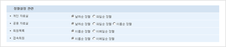 정렬설정관련 : 개인 자료실, 공용 자료실, 회원목록, 접속회원 기능에 기본적인 정렬 설정값을 설정합니다. |
