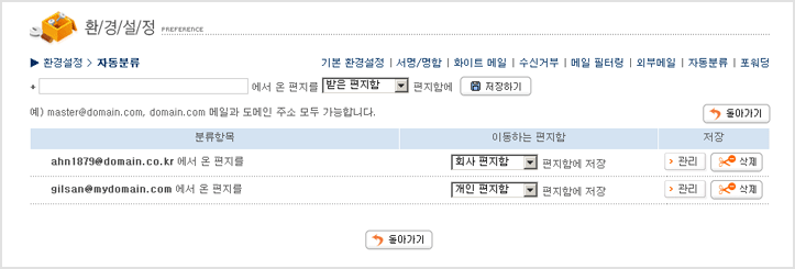 메일 필터링은 주로 스팸메일을 차단하기 위해서 사용한다면 자동분류는 사용자에게 들어오는 메일을 분류하여 보다 사용하기 편하도록 합니다. 자동분류는 메일주소뿐만 아니라 도메인명도 입력할 수 있어 특정 도메인으로부터 발송되는 모든 메일을 지정한 편지함에 저장할 수 있습니다. |