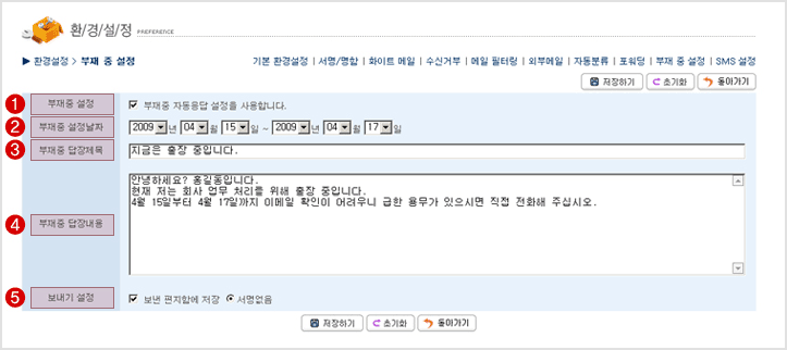 부재 중 설정은 웹메일 사용자가 여행이나 출장을 갔을 때 메일 보낸 이에게 메일 수신이 어렵다는 정보를 알릴 수 아주 유용한 기능이며 날짜, 제목, 답장 내용 기입만으로 간단하게 설정이 가능합니다. |