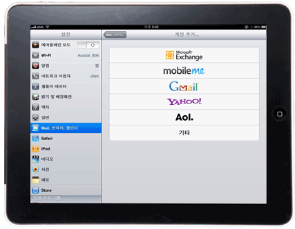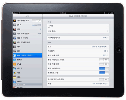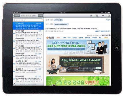 | 10. 아이패드가 메일 서버에 접속하여 메시지를 받으면 왼쪽에 메시지 목록이 나타납니다. 메시지 목록을 선택하면 화면 오른쪽에서 메일 본문을 확인할 수 있습니다. |
