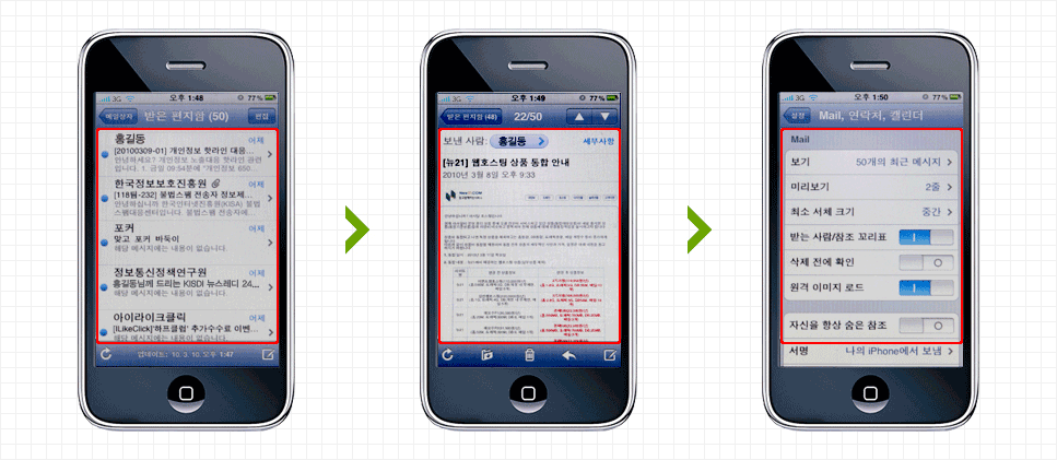 | 웹메일은 대표적인 스마트폰인 아이폰에서도 손쉽게 즐길 수 있습니다. 다음은 아이폰에서 웹메일 설정 후, 수신된 메일을 확인할 수 있는 방법에 대한 안내입니다. |