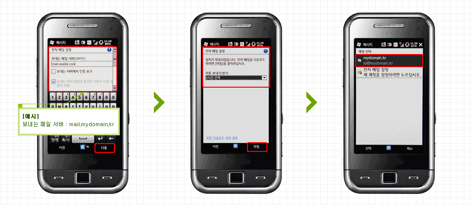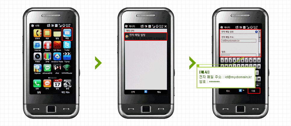 다음은 옴니아폰에서 웹메일 설정을 하는 방법입니다. |