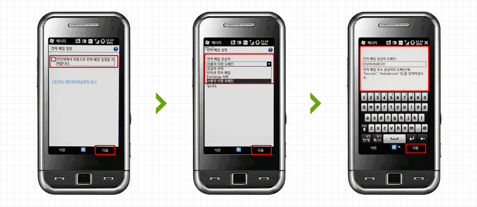 6. 전자 메일 공급자 도메인을 정확하게 기입한 후에 다음을 선택하십시오. |