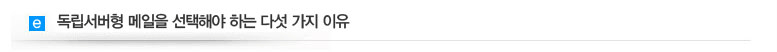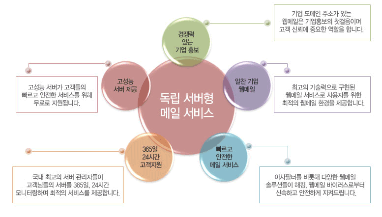 독립서버형 메일서비스는 웹메일 서버를 여러 기업과 공유해서 사용하는 일반적인 메일 호스팅과는 달리 고객님 자체 웹메일 서버를 구축하고 단독으로 운영하는 서비스를 말합니다. 독립서버형 메일 서비스는 타업체로 인한 장애로부터 안전하며, 웹메일 용량 면에서도 각 계정별 하드 용량 범위 내에서 넉넉하게 사용할 수 있습니다. 또한 웹메일 및 서버 관리를 전문 관리업체가 대행함으로써 비용이 절감되며, 일정 규모 이상의 고품격 웹메일 서비스를 원하는 기업에게 적합합니다.