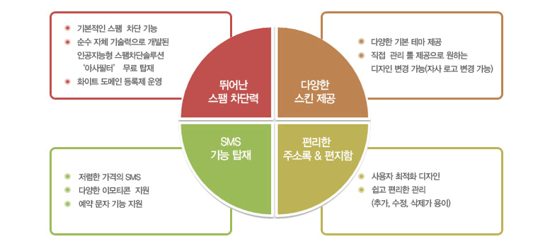 스팸차단(수준별 설정가능), 수신거부, 수신확인, 편지쓰기(웹에디터 기능),