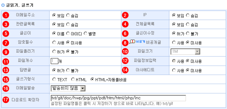 15. 글쓰기형식 : 글 쓰기 형식(TEXT, HTML, HTML+자동줄바꿈)을 선택할 수 있습니다.