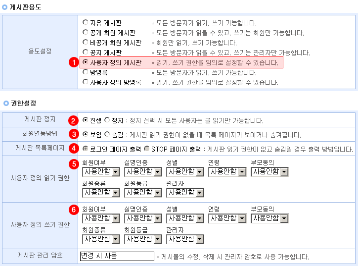 6. 사용자 정의 쓰기 권한 : 사용자 정의 쓰기 권한을 선택할 수 있습니다. 권한의 설정은 회원관리프로그램에서 변경하십시오.