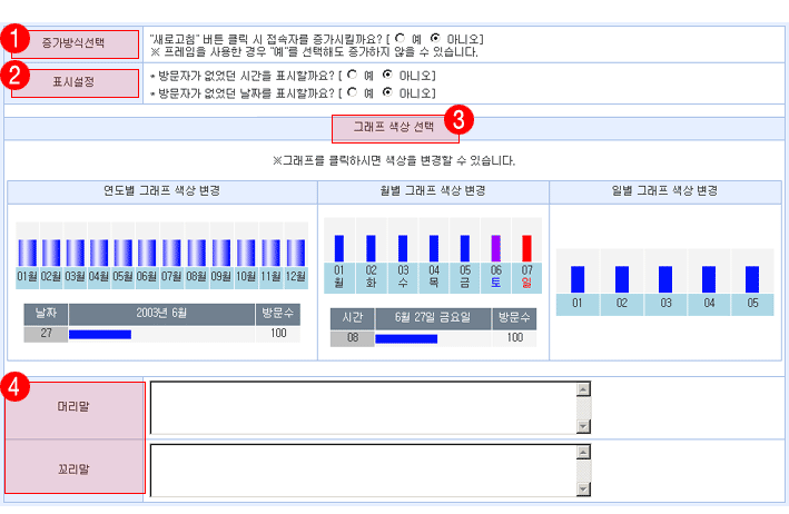 1. 증가방식 선택 : "새로고침" 버튼 클릭 시 접속수 증가여부를 설정할 수 있습니다.