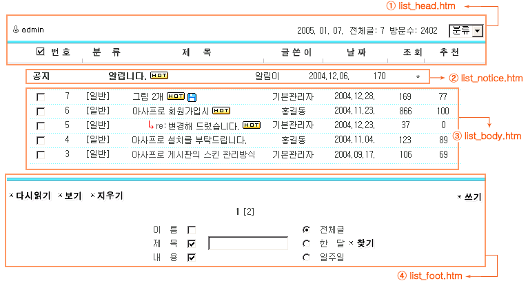 ※ 체크박스(여러글 보기/삭제) 옵션에 따라 사용되지 않는 파일 등 3개로만 구성되어 있고 각각의 태그 포함 범위는 다음과 같습니다.