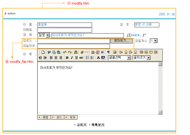 ② modify_file.htm : 파일개수에 따라 반복 출력되는 첨부파일과 파일정보 부분을 포함하는 파일입니다.