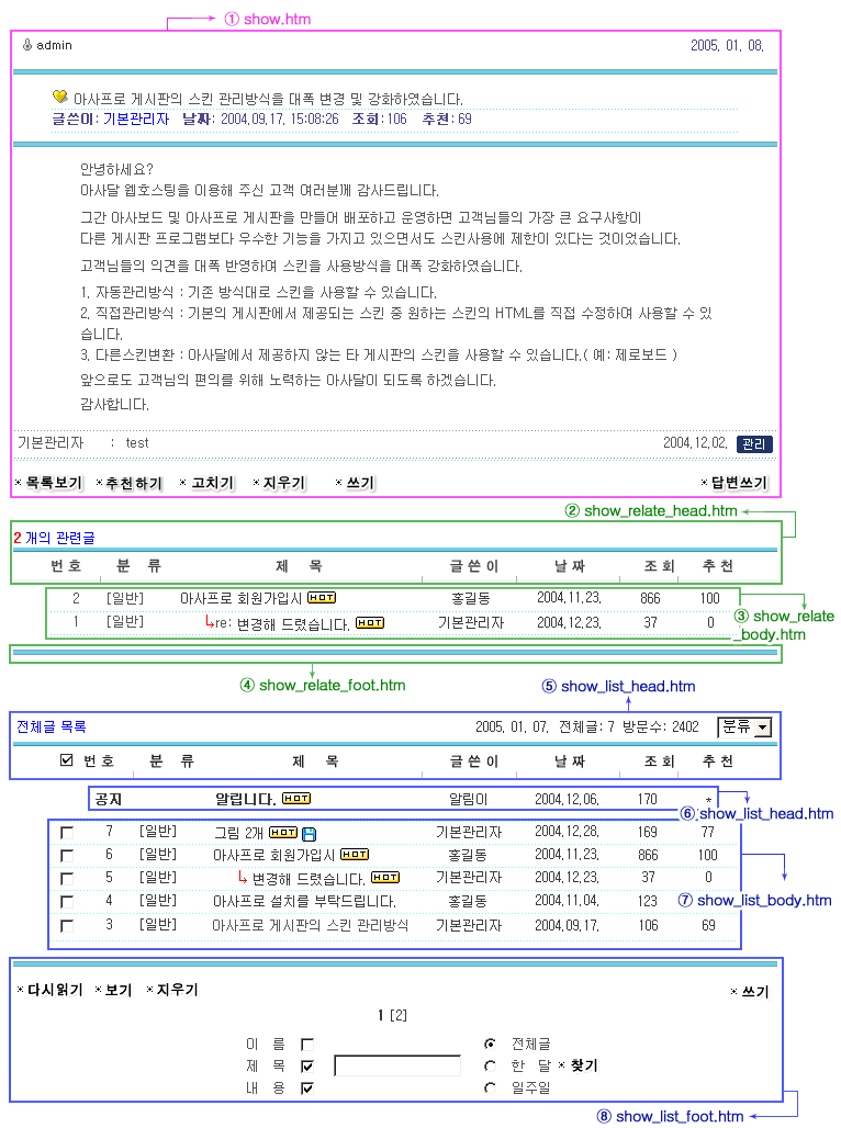 ⑧ show_list_foot.htm : 게시물 끝부분부터 버튼, 페이지, 검색을 포함하는 목록화면 끝부분까지의 파일입니다.