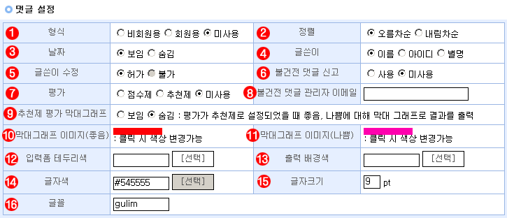 1. 형식 : 댓글 관련 사용여부 및 비회원용, 회원용으로 사용여부를 체크합니다.