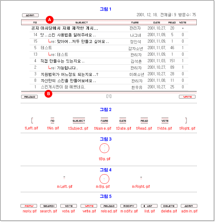 위 그림의 이름, 제목, 내용, 전체글, 한달, 일주일, 비밀번호, IP, 내용, 파일업로드의 이미지를 자신의 홈페이지에 맞게 변경합니다.