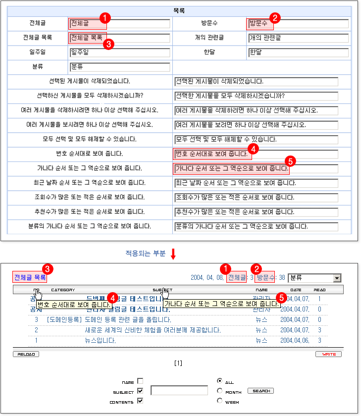몇 가지 문구 변경부분을 예로 들었습니다. 게시판의 모든 문구는 변경이 가능합니다. |