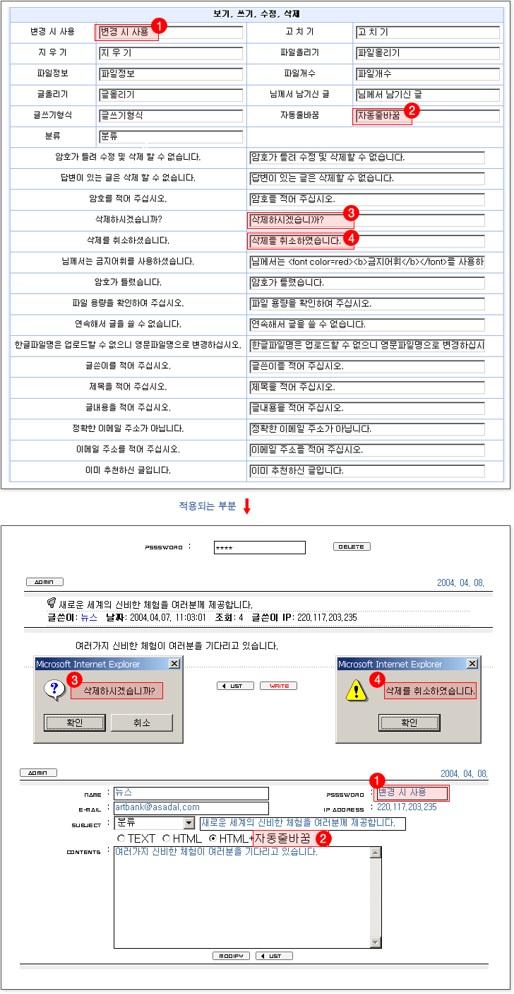 몇 가지 문구 변경부분을 예로 들었습니다. 게시판의 모든 문구는 변경이 가능합니다. 경고창 문구도 변경이 가능합니다. |