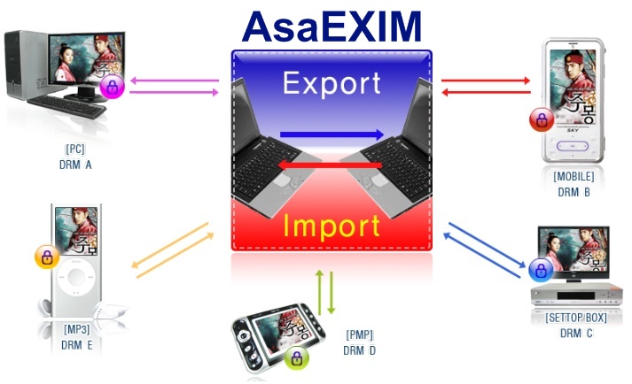 아사엑심은 서로 다른 DRM 시스템 사이에서 일종의 번역기와 같은 역할을 합니다.
