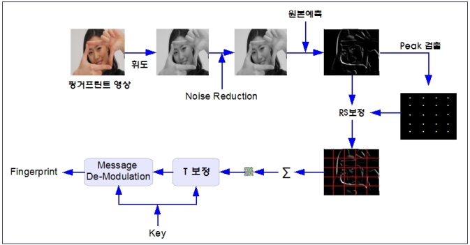 • 만약 이미지가 변형되었을 경우 - 크기 조정, 회전, 위치 이동 - 반복적으로 삽입한 암호화된 메시지의 위치를 이용하여 원본과 가장 가깝게 보정합니다. 따라서 이미지에 변형을 가하더라도 핑거프린트가 추출됩니다.