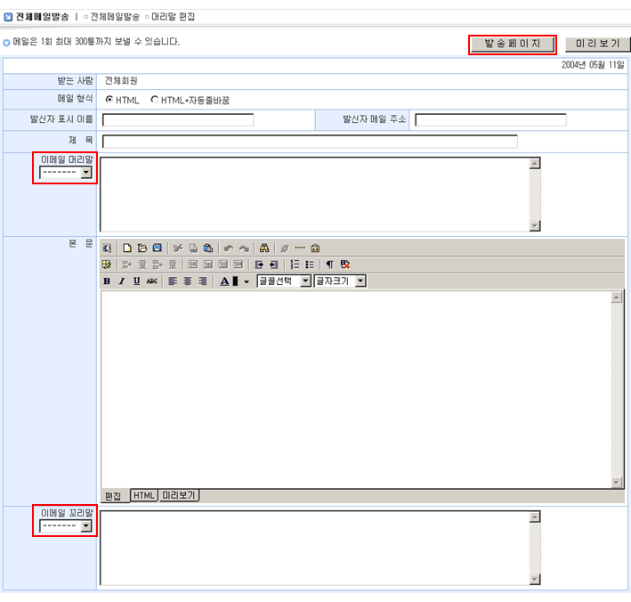 메일관리의 전체메일발송에서 머리말, 꼬리말을 설정할 수 있습니다. 자주 사용하는 메일의 머리말과 꼬리말을 정의하여 메일 발송에서 이용할 수 있습니다. 2개까지 정의 가능합니다.