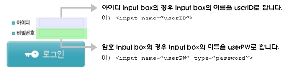 4. 폼 이름 지정 : 아이디, 암호 넣는 input box의 이름을 아래와 같이 줍니다.