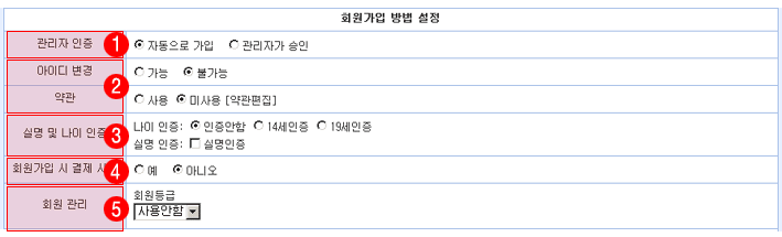 1. 관리자 인증 : 회원가입시 자동으로 가입이 될것인지 관리자의 승인 후 가입이 될것인지를 설정할 수 있습니다.