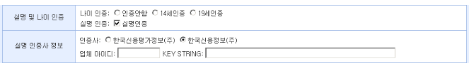 3. 실명 및 나이인증 : 실명인증 및 나이인증 필요 시 선택하시면 됩니다.(14세인증 : 부모님 동의방법에서 원하시는 항목에 체크를 하신 후 입력란에 필요한 정보를 입력하시면 됩니다.실명인증 : 인증사를 선택하신 후 입력란에 필요한 정보를 입력하시면 됩니다.)